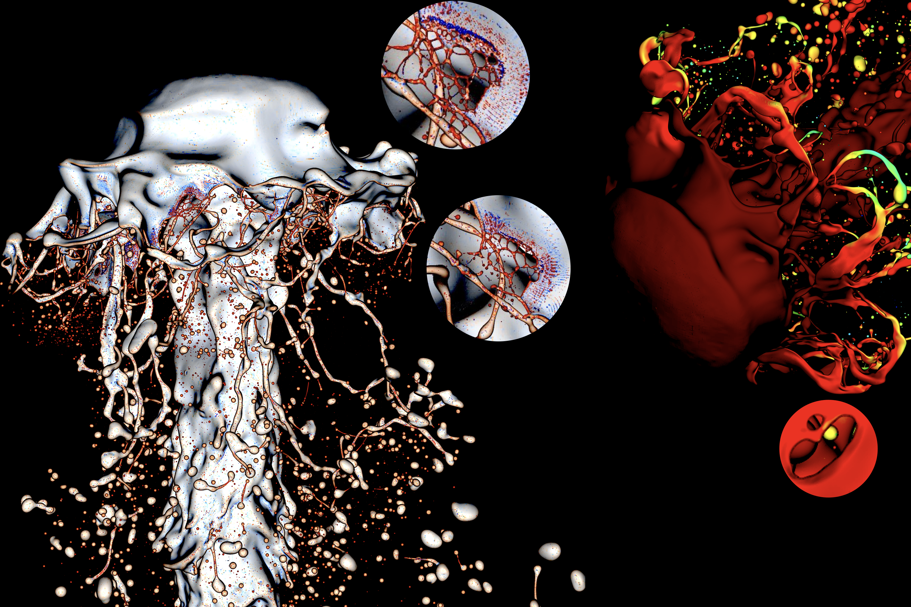 Thin-sheet rupture in an atomising pulsed liquid jet. Left: Default Volume-of-Fluid method, where curvature-colored interfaces reveal ripples that emerge as the sheet thins to the grid scale, triggering grid-dependent breakup. Right: Manifold Death breakup model, shown with interfaces colored by axial velocity, producing a cleaner and grid-converged sheet rupture. Insets highlight the contrasting thin-sheet rupture dynamics. See [1] for full details.